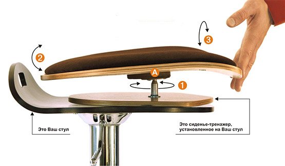 Имея единственную точку опоры (А), сиденье-тренажер "Доктор Кипарис" вызывает состояние неустойчивого равновесия, включая вестибулярный аппарат, который рефлекторно активирует глубоко расположенные позвоночные мышцы. Благодаря возможности совершать вращение (1), наклоны вперед-назад (2) и влево-вправо (3) достигается эффект, сравнимый с лечебной ездой на лошади и плаваньем: